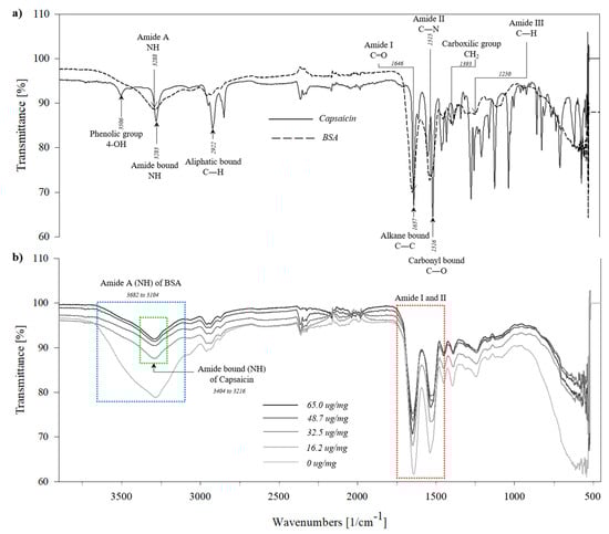 The assignment of the vibrations of the functional groups of capsaicin molecules can be interpreted in different ways. In previous reports, the FTIR spectra of capsaicin were reported to show three characteristic peaks at 3278, 2922 and 1600 cm−1 [,]. However, we found slight changes with respect to the previous report because the first peak was observed at 3506 cm−1, the second at 3283 cm−1, the third at 2922 cm−1 and finally, a group of peaks was seen from 1637 cm−1 to 1516 cm−1. For this study, a satisfactory interpretation considered the fundamental modes of vibration by observing the position, shape and intensity of bands []. The first peak was assigned to –OH groups; this functional group has been described at 3700–3300 cm−1 for plant metabolites, and in the capsaicin this resonance probably corresponds to the phenolic 4-OH group [], detected at 3506 cm−1 (Figure 3a). The second peak corresponds to the amide bond N–H stretching of the capsaicin molecule []; this functional group has been described at 3450–3250 cm−1. The third peak was attributed to the aliphatic C–H bond stretching vibration; this functional group is usually found in the spectral range from 3100–3000 cm−1 []. However, for the capsaicin molecule, the bands were recorded at 2927 cm−1 and 2874 cm−1. Finally, the resonances at 1626, 1596, 1553 and 1528 cm−1 were assigned to the C–C and C–O stretching vibrations; the frequency showed a range from 1600–1528 cm−1 (Figure 3a, solid line) []. On the other hand, the BSA native protein spectrum showed a major peak at 3288 cm−1 that corresponds to amide A, related to N–H stretching, at 1646 cm−1 the vibrance corresponds to amide I associated to C=O stretching, at 1515 cm−1 the peak was attributed to amide II related to C–N stretching and N–H bending vibrations. The CH2 bending groups were associated to the peak at 1393 cm−1. The vibration of the peak at 1250 cm−1 corresponds to amide III related to C–N stretching and N–H bending (Figure 3a, dotted line); a similar spectrum was reported by Bronze-Uhle et al. [].