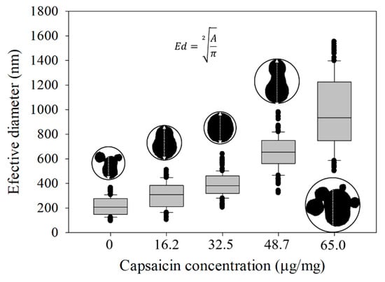 Effective diameter of the isolated nanoparticles showed an increasing tendency with respect to the concentration of capsaicin. The equation of effective diameter (Ed) is also displayed. Conditions: digital measurement of n = 180 nanoparticle images at 1376 × 1032 pixels and 8 bits of compression; resolution set at 2.1 pixels/nm. Values are the means of three experimental replicates ± standard deviations.
