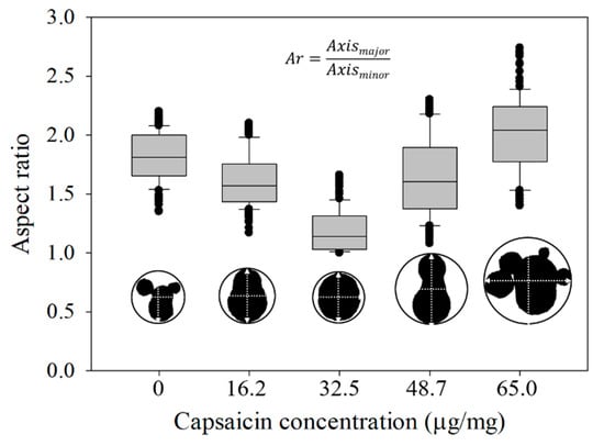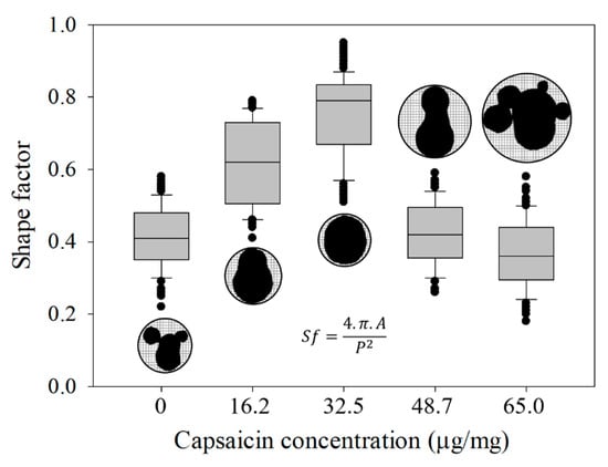 On the other hand, the aspect ratio (Ar) and shape factor (Sf) showed an asymmetrical response. The values for the capsaicin concentrations 0, 16.2, 32.5, 48.7 and 65.0 µg/mg were Ar = 1.81, 1.62, 1.19, 1.65 and 2.02, while Sf = 0.41, 0.61, 0.76, 0.42 and 0.37, respectively (Figure 6 and Figure 7).