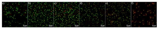 Hormesis is a term used by toxicologists to refer to a biphasic dose response to an environmental agent characterized by a low dose stimulation or beneficial effect and a high dose inhibitory or toxic effect []. The inhibition effect of capsaicin on seed germination and conidial germination has been described in different studies. It is known that the inhibition of germination is dependent on the concentration of capsaicin; a high capsaicin concentration causes greater mortality of cells [,]. However, in this study the exposure of R. mucilaginosa to BSA-capsaicin nanoparticles, a hormesis behaviour in the fungi cell growth was observed. AO/PI staining allowed us to distinguish between live and dead cells in the treatment cultures. Nevertheless, we added a buffer assay for comparing normal growth of R. mucilaginosa with the BSA-capsaicin nanoparticle treatments. In the control (only buffer) an abundant presence of yeasts with green fluorescence was observed (Figure 8a); the yeast culture exhibited mostly viable cells with 63.83 × 106 ± 3.5 × 106 cells/mL and a minor quantity of dead cells (1.86 × 106 ± 0.57 × 106 cells/mL), while in the 0 μg/mg treatment, the population of viable R. mucilaginosa was increased 89.6 × 106 ± 1.85 × 106 cells/mL; no inhibition of growth was observed (cell death 0.33 × 106 ± 0.05 × 106 cells/mL), and the images showed abundant yeast fluorescing in the green spectrum (Figure 8b). At 16.2 μg/mg of capsaicin (low concentration), the culture presented an increase in green fluorescent yeasts (123.16 × 106 ± 10.88 × 106 cells/mL) and death cells (2.70 × 106 ± 1.32 × 106 cells/mL) were observed with more frequency in all images (Figure 8c). The tendency to increase the viability of R. mucilaginosa changed at 32.5 μg/mg, since the viability was only observed in mature cells 92.73 × 106 ± 2.90 × 106 cells/mL, whilst, death cells increased the population 5.16 × 106 ± 1.80 × 106 cells/mL. Interestingly, many of the dead cells were smaller, which implies that the most susceptible cells to BSA-capsaicin NPs were the youngest cells (Figure 8d), probably due to the permeability of their cell walls. At 48.7 μg/mg of capsaicin (high concentration) a decrease of the viable yeast population (68.70 × 106 ± 5.65 × 106 cells/mL) was seen; the dead cells showed an increased population (42.03 × 106 ± 12.63 × 106 cells/mL). It must be noted that the dead cells were young cells, produced during yeast budding events. However, mature dead cells were also observed (Figure 8e). Finally, at 65.0 μg/mg of capsaicin, the high concentration treatment caused complete growth inhibition; the dead cells showed a major value (75.66 × 106 ± 5.69 × 106 cells/mL), whereas on the contrary, the viability of cells showed the lowest value of all treatments (3.56 × 106 ± 3.20 × 106 cells/mL). Interestingly, the images showed mature dead cells (Figure 8f).
