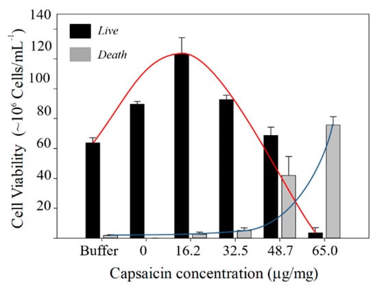 The growth of the yeast showed higher stimulation than the controls at low capsaicin concentration (16.2 μg/mg), followed by inhibition at the highest capsaicin concentration (65.0 μg/mg), this phenomenon is considered as a hormesis effect; the graph of the viability counterstain showed a typical dose-response effect resembling an inverted U-shape graph for a positive effect and J-shape graph for a negative effect (Figure 9).