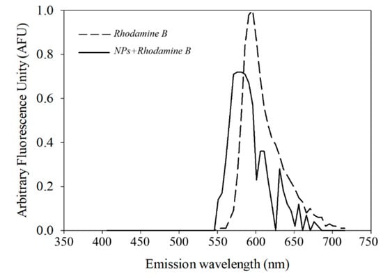 To 1 mL of nanoparticles at 0 µg/mg was added 1 μL rhodamine B solution at 1% (Hycel, Jalisco, México) for staining and incubated for 15 min under darkness at room temperature; subsequently, the sample was washed three times with deionized water. The spectrum of emission of the rhodamine B was analysed directly from the stock solution. The samples were mounted on glass slides, covered with high performance Zeiss cover glasses (D = 0.17 mm +/− 0.005 mm refractive index = 1.5255 +/− 0.0015, Abbe number = 56 +/− 2) and observed in a multiphoton microscope system (LSM 880–NLO, Zeiss, Oberkochen, Germany) equipped with an Ti:Sapphire laser (Chameleon vision II, COHERENT, Santa Clara, CA, USA) capable of tuning in ranges from 690 to 1060 nm. Detection of spectral emission of rhodamine B and nanoparticles stained with rhodamine B was performed by multiphoton microscopy. The samples were observed and analysed with immersion objective 60×/1.4, NA ∞−0.17, Zeiss Plan NEOFLUAR. The rhodamine B spectrum (from 547 to 602 nm) was obtained from the data-base of Zeiss microscope dyes. The experimental detection of the spectrum of rhodamine B pure and nanoparticles dyed with rhodamine B was carry out with chameleon laser syntonised at 810 nm with 0.2% of power and detected at 538–656 nm with a photomultiplier GaSP at 900 mV of sensibility. All micrographs were captured in CZI format at 1131 × 1131 pixels and RGB colour. The spectral graphs were analysed in Sigma plot 12 (Systat Software, Inc.).