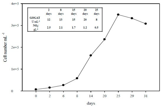 For glutamate synthase activity determination (GOGAT EC 1.4.7.1), the cell suspension was filtered under a vacuum (Millipore filter membrane 0.45 µm) and added in a 20 mM phosphate buffer (pH 7.5), ratio 1:3 (w/v), with 0.5 mM EDTA and 0.1 mM DTT. Then, the sample was sonicated at 4 °C for 3 min. (10 s on, 20 s off) at 18 KHz, using a Transsonic 460/H Elma cell disrupter and centrifuged at 10,000 rpm for 10 min at 4 °C. The supernatant was used for the GOGAT assay [58]. One unit of the specific activity of GOGAT was expressed as the amount of enzyme needed to produce 1 nmol of glutamate per milligram of protein at 30 °C.