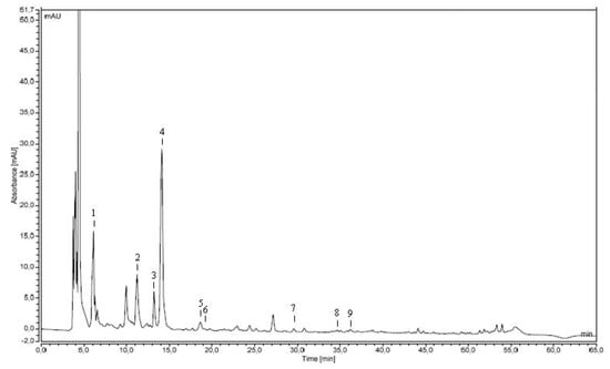 Figure 2. The representative chromatogram of phenolic compounds extracted from the fresh biomass of Spirulina platensis: absorbance at 272 nm. Peak identifications were performed by retention time and UV spectra against commercially available reference compounds. Peaks: gallic acid (1) catechin (2), caffeic acid (3), p-hydroxybenzoic acid (4), p-coumaric acid (5), ferulic acid (6) quercetin (7), genistein (8) and kaempferol (9).