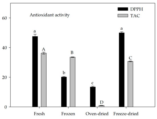 Figure 3. The 1,1-Diphenyl-2-Picrylhydrazyl radical scavenging activity (DPPH, % inhibition) and Total Antioxidant Activity (TAC, µg α-tocopherol g D.W.−1). Different letters indicate, within the same assay, significant differences (p ≤ 0.05) among A. platensis samples.