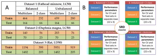 The three toxicity datasets (aqueous and acute toxicities, see Section 3.1) were used with the training and test splits indicated at their respective sources. The dataset-specific splits are included in Figure 2A for the balanced and imbalanced designs and the 2-class and multiclass cases.