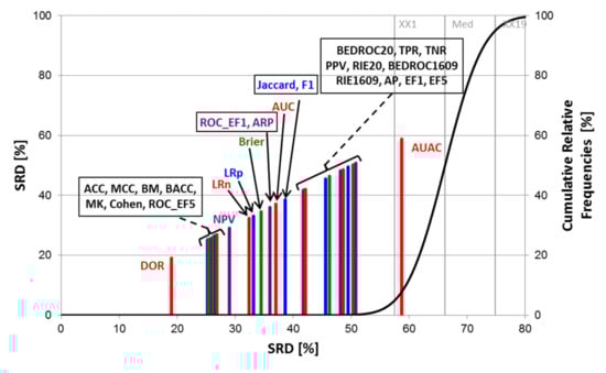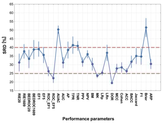 Focusing only on the performance parameters, the results of the four SRD runs are merged in Figure 5, showing the average SRD values for each performance parameter. If we define two separation thresholds based on the observations, it can be concluded that the most consistent performance parameters are the diagnostic odds ratio (DOR), the ROC enrichment factor at 5% (ROC_EF5) and the markedness (MK). Accuracy is also close the most consistent ones, but interestingly, its balanced analog (BACC) seems to be somewhat worse. At the other end of the scale, area under the accumulation curve (AUAC) and the Brier score loss are not recommended.
