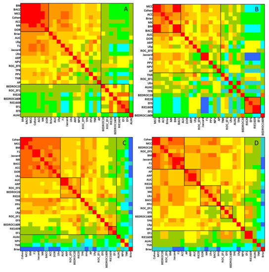 Results of the SRD-COVAT method: 2-class classification with balanced (A) and imbalanced (B) classes; and multiclass classification with balanced (C) and imbalanced (D) classes. Clusters of similarly behaving performance parameters are separated with black lines (squares) on the plot based on visual inspection.