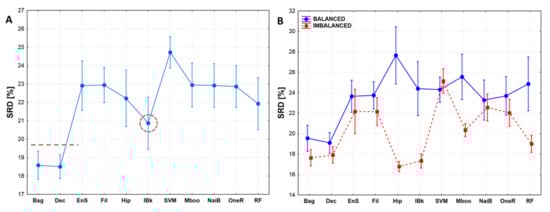 (A) Normalized SRD values for the eleven classifiers. Error bars mean 95% confidence intervals. Recommended classifiers are below the dotted line, dotted circle shows an intermediate one. (B) Decomposition of the classifiers according to dataset composition (balanced vs. imbalanced classes). Normalized SRD [%] was scaled between 0 and 100.