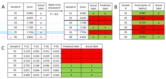 Mock datasets to showcase common classification scenarios. (A) In structure-based virtual screening, a docking score is commonly used as a rough estimator of the free energy of binding between ligand and protein (the smaller the better). Predicting a ligand to be active/positive requires setting a threshold value of the docking score (T): each ligand with a better score will be considered a predicted active/positive. (B) In 2-class classification, machine learning methods typically output probability values for each sample, for belonging to the positive class. A probability value of 0.5 or higher is a natural choice to assign the samples into the positive class. Naturally, other choices can be applied as well: in the above example, setting the threshold value to either 0.6 or 0.4 would reduce the number of misclassified samples by one. (C) In multiclass classification, the most straightforward option is to assign each sample to the class with the highest predicted probability. (Green: correct, red: incorrect classification.).