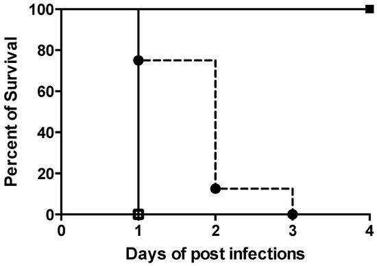 We first demonstrated 100% mortality in animals infected intravenously (iv) with 109 CFU/mouse of the A. baumannii strain at 24 h post-infection (Figure 1). In addition, 100% mortality was observed in animals infected by 108 CFU/mouse of the A. baumannii strain at 3 days post-infection (Figure 1).