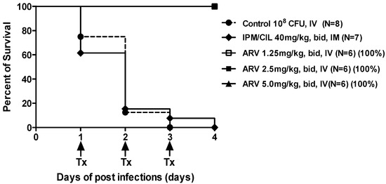 All ARV-1502 monotherapies, including 1.25, 2.5 and 5.0 mg/kg, had 100% survival, while untreated control and IPM/CIL alone treated animals had 100% mortality at 4 days post-infection (Figure 2).