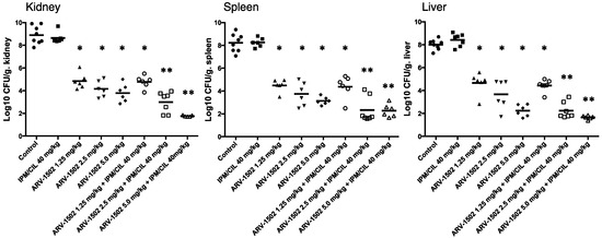A. baumannii burden in the target tissues (kidney, spleen and liver) were quantified as CFU per gram of target tissues in the murine bacteremia model following different regimens. * p < 0.001 vs. control and IPM/CIL alone groups, ** p < 0.05 vs. respective ARV-1502 monotherapy group, using Student’s t-test. At least six mice per group were analyzed.