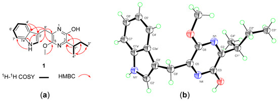 Compound 1 was isolated as a colorless plate crystal. Its molecular formula was determined to be C18H21N3O2 by HRESIMS, indicating 10 degrees of unsaturation. The IR spectrum showed the presence of the hydroxy or amino (3421 cm−1) and the aromatic ring (1615 cm−1) groups. The 1H-NMR spectrum in CDCl3 (Table 1) revealed three methyl signals comprising a methoxy (δH 3.98) and two aliphatic methyls (δH 1.20, d; 0.87, t), two methylenes (δH 4.13/4.10; 1.81/1.55), a methine (δH 3.15), four protons between δH 7.09 and 7.68 ascribed to an ortho-disubstituted aromatic ring, an isolated olefinic proton (δH 7.22), as well as an exchangeable proton (δH 8.04, H-1′). The 13C-NMR and DEPT spectra showed 18 carbon signals, including three methyls, two methylenes, five sp2 one aliphatic methine, and seven non-protonated sp2 carbons. The COSY correlations of H-4′/H-5′/H-6′/H-7′ and H3-4′′/H-1′′/H-2′′a/H-2′′b/H3-3′′ confirmed the presence of the ortho-disubstituted aromatic ring and a sec-butyl fragment (Figure 2a). The HMBC cross-peaks of H2-8′ with C-2′, C-3′, and C-3a′; NH-1′ with C-3′, C-7′, and C-7a′; and H-4′ with C-3′ and C-3a′ suggested that the aromatic ring was present as an (indole-3-yl)methyl unit. In the 13C-NMR spectrum, four unassigned quaternary carbons resonated at δC 153.3, 149.8, 148.7, and 128.7. In addition, the remaining atoms required by the molecular formula included a hydrogen, an oxygen, and two nitrogens. By taking into consideration the unsaturation requirement, these data suggested the presence of a pyrazine ring in the molecule [15,16]. The HMBC correlations of H-1′′ with the carbons at δC 153.3 (C-2) and 149.8 (C-3) along with the correlation of H-4′′ with the carbon at δC 149.8 (C-3) located the sec-butyl at C-3 of the pyrazine ring. The HMBC correlations of H2-8′ with the carbons at δC 128.7 and δC 148.7 along with the correlation of the methoxy protons (δH 3.98) with the carbon at δC 148.7 suggested that the (indole-3-yl)methyl unit and the methoxy group were attached to the carbons at δC 128.7 and δC 148.7, respectively. However, these correlations did not allow for distinction of 2,5- versus 2,6-dioxy substitutions and thus could not define the location of the methoxy group (C-5 or C-6). Furthermore, it was not possible to determine whether the C-2 of the pyrazine ring was enolized based on the NMR data [15,16]. Therefore, compound 1 was subjected to X-ray crystallographic analysis using Cu Kα radiation (Figure 2b), which unambiguously established the structure as 1 with an enol group at C-2. The small values of the Flack parameter 0.02 (8) [17] and the Hooft parameter 0.04 (7) [18] in the final refinement of the crystallographic data allowed for assignment of the absolute configuration of 1 as 1′′S. Therefore, the structure of 1 was determined as (S)-6-((1H-indol-3-yl)methyl)-3-(sec-butyl)-5-methoxypyrazin-2-ol. According to the proposed biosynthetic pathway for natural pyrazines [19,20], compound 1 was probably derived from the precursors tryptophan and isoleucine and was thereby assigned the trivial name trypilepyrazinol.