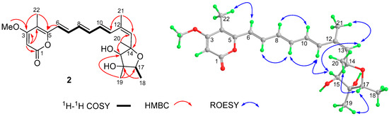 The 1H–1H COSY and the key HMBC and ROESY correlations of 2.