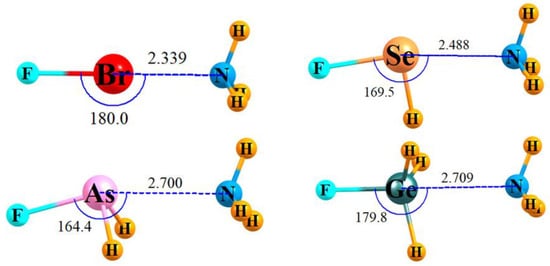 The optimized geometries of several sample complexes are pictured in Figure 1. The others are quite similar and are contained in Figure S1. The NH3 approaches the central A atom of each molecule opposite to the A–F bond (where A denotes the halogen, chalcogen, etc., atom) although in the case of the chalcogen and pnicogen bonds, the θ(FA⋯N) angle is not quite 180° due to considerations of the orientation of the σ-hole and secondary interactions [81,82,83,84]. It is the A–F bond of the Lewis acid molecule which ought to be most susceptible to modifications due to the interaction with the base, and where focus is placed below.