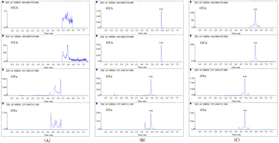 Multiple reaction monitoring (MRM) chromatograms of ochratoxin A (OTA) and ochratoxin α (OTα) in a blank urine sample (A), in spiked urine sample with the concentration of 20 ng mL−1 (B), and in urine samples collected at 12 h after oral administration of OTA in dairy cows (C).