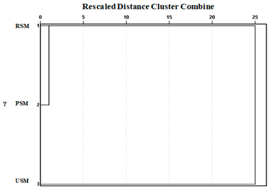 Cluster analysis (CA) of the sensory evaluation for three different skim milk samples. RSM, skim milk obtained by centrifugation of raw milk; PSM, skim milk obtained by centrifugation of raw milk after preheating treatment at 85 °C, 15 s; USM, skim milk obtained by centrifugation of raw milk after preheating treatment at 137–141 °C, 4 s.