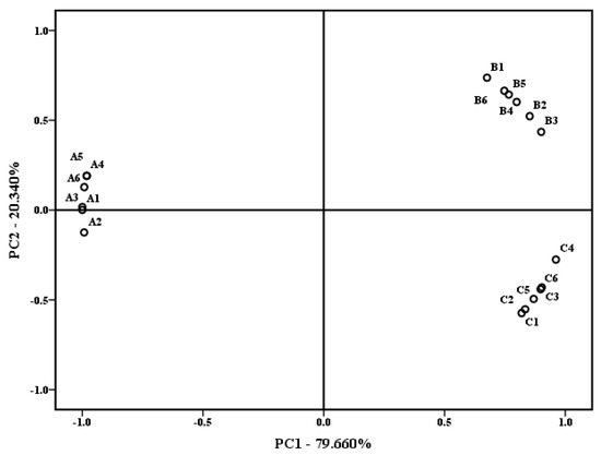 Principal component analysis (PCA) plot for electronic nose data of three kinds of skim milk samples. A, RSM; B, PSM; C, USM.