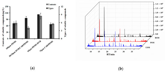 As can be seen from Figure 3a, the polydimethylsiloxane/divinylbenzene (PDMS/DVB) presented the highest sensitivity for volatile compounds of the milk. It could absorb nine types of volatiles, and the total concentrations of volatile compounds extracted were significantly higher than the other fibers. Therefore, the PDMS/DVB fiber was used to extract the volatile compounds in the milk samples.