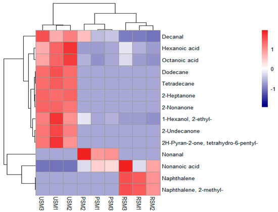 Volatile compounds were the important indicator of the flavor quality of skim milk. In our previous study, we did not evaluate the effect of volatile flavor compounds on the flavor quality of skim milk [20]. In this study, the effects of volatile compounds on the flavor of different skim milk samples were further investigated based on the GC-MS data. PCA and CA were used to express the correlation between volatile compounds and the three samples. The results in Figure 5a indicate that the first factor (PC1) presented a positive correlation with hexanoic acid, octanoic acid, dodecane, tetradecane, 2-nonanone, 2-undecanone, 2-ethyl-1-hexanol, and tetrahydro-6-pentyl-2H-pyran-2-one (6-pentyloxan-2-one). The volatiles negatively correlated to PC1 included naphthalene, 2-methylnaphthalene, nonanal, decanal, 2-heptanone, and nonanoic acid. It could deduce that the acids, alkanes, ketones, naphthalene and aldehydes significantly distinguish the flavor of the three skim milk samples. Hexanoic acid, octanoic acid, naphthalene, 2-methylnaphthalene, dodecane, and tetradecane were positively correlated to PC2, whereas nonanal, decanal, 2-nonanone, 2-undecanone, 2-heptanone, nonanoic acid, 2-ethyl-1-hexanol, and tetrahydro-6-pentyl-2H-pyran-2-one were negatively correlated. It showed that the acids, naphthalenes, ketones and aldehydes might distinguish the flavor of the three skim milk samples. From Table 2, we can observe that acids, ketones, and alkanes were mainly found in the PSM and USM, and naphthalene was only found in the RSM. This may be the main reason for the change in aroma and flavor of the skim milk after the preheating treatment.