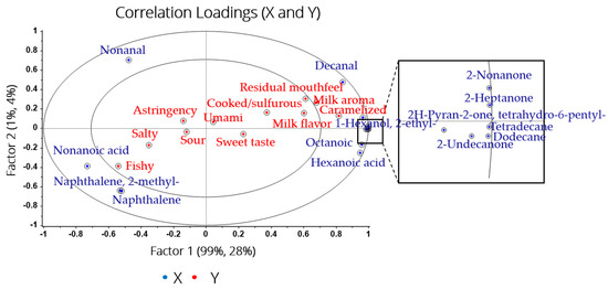 There were some correlations between flavor compounds and sensory attributes in milk. It could further explain the effect of different treatments on the flavor quality of skim milk. Compared with our previous work [20], the correlations between flavor compounds and sensory attributes were further analyzed in this study. The multivariate data analysis (partial least squares regression, PLSR) was applied to display the correlation between flavor compounds and sensory descriptors [37]. The flavor compounds (X variables) and sensory attributes (Y variables) on the first two factors are presented in Figure 6. The inner and outer ellipse revealed 50% and 100%, respectively, which explained the variance. The attributes “milk flavor”, “milk aroma”, and “caramelized” were correlated with dodecane, tetradecane, 2-ethyl-1-hexanol, 6-pentyloxan-2-one, 2-heptanone, 2-nonanone, and 2-undecanone. It has been reported that 2-heptanone and 2-nonanone were closely related with milk flavor, which possessed an odor of cream and sweetness [17,18,19]. Additionally, the correlation between decanal and “residual mouthfeel” was observed. Notably, the concentrations of these related flavor compounds were significantly the highest in the USM. It was shown that the preheating treatment at 137–141 °C could improve the sensory quality of skim milk. The attributes “fishy” was correlated with naphthalene, 2-methyl naphthalene, and nonanoic acid. It could be the reason for the poor flavor of the RSM. Briefly, although some flavor compounds could not be explained by sensory attributes, the relationship between volatile compounds and sensory attributes was obvious.
