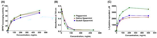 In the current study, free-radical scavenging capacity of mint EOs was assessed through the 2,2-diphenyl-1-picrylhydrazyl (DPPH) radical scavenging assay. A dose-dependent increase of radical scavenging activity was observed in all mint EOs (Figure 1A) and the maximum response was reached at the highest concentration (500 mg/mL) of each mint EO. Peppermint EO had the lowest EC50 compared to both spearmint EOs (p < 0.05, Table 2), while the EC50 of Scotch EO was greater than that of native spearmint EO (p < 0.05). These results indicated the strongest radical scavenging activity of peppermint EO.