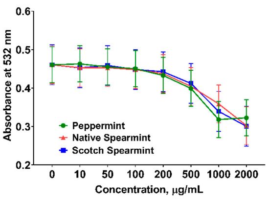 The scavenging capacity of mint EOs against 2,2-diphenyl-1-picrylhydrazyl (DPPH, Sigma, St. Louis, MO, USA) radical was determined based on the method described by Zhou et al. [60]. Briefly, test sample was mixed with DPPH solution (25 µg/mL in methanol) at a ratio of 1:39 (v/v). Blank sample was prepared by mixing methanol with DPPH solution at the same ratio. The mixture was shaken to mix well and incubated at room temperature for 30 min. At the end of incubation, the absorbance at 517 nm was read immediately using a Synergy HTX Multi-Mode Microplate Reader (BioTek, Winooski, VT). The scavenging capacity of each mint EO was calculated based on the equation: DPPH+ scavenging capacity (%) = [(Ablank − Atest)/Ablank] × 100, where Ablank was the absorbance of blank sample, and Atest was the absorbance of test sample. Half maximal effective concentrations (EC50, mg/mL) of each mint EO were calculated accordingly. A lower EC50 indicates a higher radical scavenging capacity.