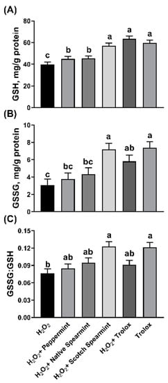 Based on the results of CAA assay, an optimal concentration of each mint EO (25 μg/mL) was selected to perform intracellular antioxidant assay. The IPEC-J2 cells were seeded in cell culture dishes (1 × 106 cells/dish) in 1 mL DMEM at 37 °C with 5% CO2 for 24 h. After washing with 1 × PBS, cells were treated with either DMEM, 1 µM Trolox, or 25 μg/mL mint EO and incubated for another 18 h. Cells were further treated with 0.5 mM H2O2 for 1 h to induce cellular oxidative stress. Cells previously treated with DMEM were challenged with (positive control) or without H2O2 (negative control). Finally, cells were scraped off the culture dish, sonicated and deproteinated (subsamples were collected to normalize samples with total protein content before deproteination). Cell lysate was used to analyze the concentrations of glutathione disulfide (GSSG) and total glutathione (GSH) with a commercial Glutathione Assay Kit (Cayman Chemical, Ann Arbor, MI). The ratio of GSSG to GSH was calculated.