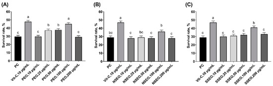Effects of mint essential oils (EOs) on survival rate of C. elegans in response to H2O2-induced oxidative stress. The nematode C. elegans were grown in normal medium (PC), or medium containing 10 µg/mL of vitamin C, or different doses (10, 25, 50, 100, and 200 µg/mL) of peppermint EO (PEO, A), native spearmint EO (NSEO, B), and Scotch spearmint EO (SSEO, C). Data were expressed as mean ± SEM from duplicated trials. Ten replicate plates (10 worms/plate) were performed for each treatment within a trial. Values without common letter were significantly different (p < 0.05).