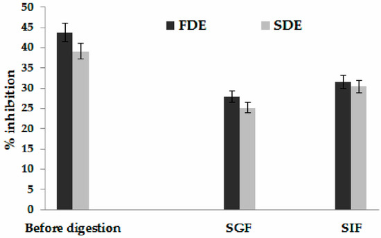 Inflammatory diseases include different types of rheumatic diseases, characterized by pain, swelling, and disturbed physiological functions. Protein denaturation is a well- documented cause of inflammation, followed by the loss of tertiary structure and secondary structure through the application of external stress or different compounds, as well as biological activities. The most commonly used drugs for the management of inflammatory conditions are non-steroidal anti-inflammatory drugs (NSAIDs). The greatest disadvantage in the presently available potent synthetic anti-inflammatory drugs lies in their toxicity, gastric irritation, thereby leading to the formation of gastric ulcers and the reappearance of symptoms after discontinuation [36]. Therefore, the search for natural bioactive compounds with anti-inflammatory activity has greatly increased in recent years. Hence, anti-denaturation of egg albumin method was chosen to evaluate anti-inflammatory activity FDE and SDE during simulated gastrointestinal digestion, where denaturation of egg albumin was induced by heat treatment (Figure 2). Diclofenac sodium was used as a positive control. Maximum inhibition of 47.13% was observed after SIF digestion of FDE, while minimum inhibition was observed after SGF of SDE (30.5%). However, both samples showed lower AIA than diclofenac sodium in concentration of 20 mg/mL (77.47%). There is significantly different values within FDE and SDE, before, and after, in vitro gastrointestinal digestion (p < 0.05).