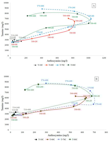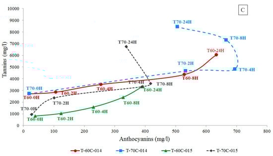 Figure 1 shows, respectively, the evolution of total tannins versus the total anthocyanins during the maceration of Syrah Florentine (Sy-F) and Syrah Saint Thomas (Sy-ST) (Figure 1A,B) of the 2014 harvest year at different temperatures (10, 60, 70 and 80 °C) for 48 h and the maceration of the 2015 grape harvest year of the Syrah Saint Thomas musts at 60 and 70 °C for 24 h (Figure 1C). The results showed that temperature affects the amounts of tannins and anthocyanins released from skins and seeds to the must. By macerating at 10 °C, the anthocyanin and tannin concentrations increased slightly during the 48 h to reach a maximum of total anthocyanins of 129.79 and 140.29 mg/L, respectively, for the 2014 Sy-ST and Sy-F grape musts. The maximum concentrations of tannins were ([tanins]Sy-ST = 3112.13 mg/L; [tanins]Sy-F = 2719.09 mg/L). Contrariwise, temperature of 60 °C showed a gradual increase in the concentrations of total tannins and anthocyanins (compared to 10 °C) for both grape varieties from the two different regions and years, and the tanins concentration reached its maximum after 48 h ([tanins]Sy-ST = 6301.58 mg/L, ([tanins]Sy-F = 7029.70 mg/L) and for anthocyanins after 24 h ([anthocyanins]Sy-ST-014 = 633.79 mg/L, [anthocyanins]Sy-F = 822.79 mg/L, [anthocyanins]Sy-ST-015 = 413.10 mg/L). A slight decrease was observed when the heating lasted up to 48 h—the concentrations reached were, respectively, 544.25 and 744.92 mg/L for the 2014 Sy-ST and Sy-F. For temperatures of 70 and 80 °C, a more rapid increase in anthocyanin and tannin concentrations was observed compared to 10 and 60 °C. Similarly, the maximums reached were greater. As for total anthocyanins for the Sy-ST grape must, concentrations reached 694.46 and 680.46 mg/L at 70 and 80 °C, respectively, after 4 h for the 2014 harvest year and 417.37 mg/L at 70 °C after 8 h for the 2015 harvest year. For Sy-F, the maximum concentration was 1033.08 mg/L at 70 °C after 8 h and 1005.60 mg/L at 80 °C after 4 h. Beyond these maximums, a significant decrease in total anthocyanins was observed for the different grape musts and harvest years. This decrease was much greater for 80 than for 70 °C, and concentrations were, respectively, divided by an average factor of 5.05 and 1.79. Concerning tannins concentrations, at 70 °C and for the different grape musts, the maximum tannin extraction was achieved after 48h with a concentration of 8730.72 and 8833.81 mg/L for the 2014 Sy-ST and Sy-F, respectively. For maceration at 80 °C, the maximum extraction was reached faster after 24 h of maceration with a value of 8498.75 mg/L for Sy-ST-014. A slight decrease of 12.13% and 7.45% was noted, respectively, when maceration was prolonged for 48 h for Sy-ST and Sy-F. After alcoholic fermentation, the Sy-ST control (25 °C) showed an anthocyanin concentration of 220.25 mg/L, which is lower than the maximum obtained at 60, 70 and 80 °C. Besides, the Syrah control showed a lower tannin content than the Syrah must from different regions and harvest years macerated at different temperatures (data not shown).