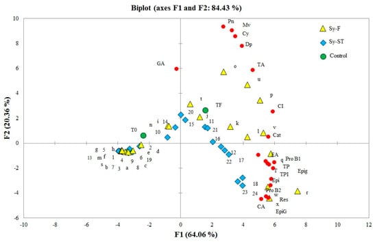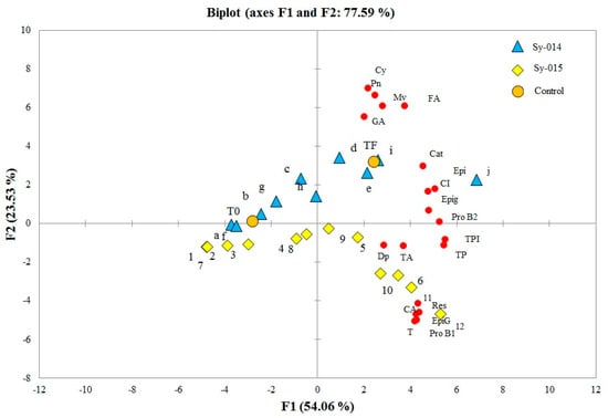Biplot of the two first principal components obtained from the color and phenolic composition of the Sy-F (Syrah Florentine) and Sy-ST (Syrah Saint Thomas) musts compared to the Syrah Saint Thomas control (Sy-control): TA, total anthocyanin content; CI, color intensity; TPI, total polyphenol index; TP, total polyphenols; T, tannins; Dp, delphinidin-3-O-glucoside; Cy, cyanidin-3-O-glucoside; Pn, peonidin-3-O-glucoside; Mv, malvidin-3-O-glucoside; GA, gallic acid; pro B1, procyanidin B1; EpiG, epigallocatechin; cat, catechin; Pro B2, procyanidin B2; CA, caffeic acid; Epi, epicatechin; Epig, epicatechin gallate; FA, ferulic acid; Res; resveratrol; obtained after maceration at different temperatures (10, 60, 70 and 80 °C) for 48 h (a, Sy-F-0-10 °C; b, Sy-F-2-10 °C, c, Sy-F-4-10 °C; d, Sy-F-8-10 °C; e, Sy-F-24-10 °C; f, Sy-F-48-10 °C; g, Sy-F-0-60 °C; h, Sy-F-2-60 °C; i, Sy-F-4-60 °C; j, Sy-F-8-60 °C; k, Sy-F-24-60 °C; l, Sy-F-48-60 °C; m, Sy-F-0-70 °C; n, Sy-F-2-70 °C; o, Sy-F-4-70 °C; p, Sy-F-8-70 °C; q, Sy-F-24-70 °C; r, Sy-F-48-70 °C; s, Sy-F-0-80 °C; t, Sy-F-2-80 °C; u, Sy-F-4-80 °C; v, Sy-F-8-80 °C; w, Sy-F-24-80 °C; x, Sy-F-48-80 °C; 1, Sy-ST-0-10 °C; 2, Sy-ST-2-10 °C; 3, Sy-ST-4-10 °C; 4, Sy-ST-8-10 °C; 5, Sy-ST-24-10 °C; 6, Sy-ST-48-10 °C; 7, Sy-ST-0-60 °C; 8, Sy-ST-2-60 °C; 9, Sy-ST-4-60 °C; 10, Sy-ST-8-60 °C; 11, Sy-ST-24-60 °C; 12, Sy-ST-48-60 °C; 13, Sy-ST-0-70 °C; 14, Sy-ST-2-70 °C; 15, Sy-ST-4-70 °C; 16, Sy-ST-8-70 °C; 17, Sy-ST-24-70 °C; 18, Sy-ST-48-70 °C; 19, Sy-ST-0-80 °C; 20, Sy-ST-2-80 °C; 21, Sy-ST-4-80 °C; 22, Sy-ST-8-80 °C; 23, Sy-ST-24-80 °C; and 24, Sy-ST-48-80 °C. To, Syrah control at the beginning of maceration; TF, Syrah control at the end of alcoholic fermentation.