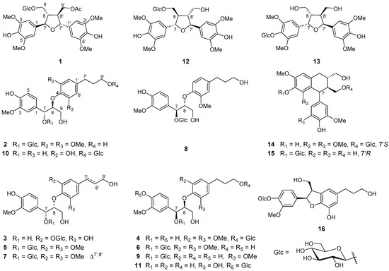 By comparison of their spectroscopic and specific rotation data with those of the known compounds, the remaining 11 compounds were identified as (7R,8R)-threo-4,9,9’-trihydroxy-3,3’,5’-trimethoxy-8-O-4’-neolignan-7-O-β-d-glucopyranoside (5) [21], rourinoside (6) [22], (7R,8R)-threo-guaiacylglycerol-8-O-4’-sinapyl ether-7-O-β-d-glucopyranoside (7) [23], (7S,8R)-erythro-4,9,9’-trihydroxy-3,3’-dimethoxy-8-O-4’-neolignan-7-O-β-d-glucopyranoside (8) [24], (7S,8S)-threo-4,9,9’-trihydroxy-3,3’-dimethoxy-8-O-4’-neolignan-7-O-β-d-glucopyranoside (9) [24], (–)-(7R,8S)-4,7,9,3′,9′-pentahydroxy-3-methoxy-8-O-4′-neolignan-9′-O-β-d-glucopyranoside (10) [25], (7S,8S)-4,7,9,3’,9’-pentahydroxy-3-methoxyl-8-O-4’-neolignan-4-O-β-d-glucopyranoside (11) [26], (7S,7’S,8R,8’R)-icariol A2-9-O-β-d-glucopyranoside (12) [16], (7S,7’S,8S,8’S)-icariol A2-4-O-β-d-glucopyranoside (13) [27], lyoniresinol-9’-O-β-d-glucopyranoside (14) [28], (−)-isolariciresinol 4-O-β-d-glucopyranoside (15) [29], and cedrusin-4’-O-β-d-glucopy ranoside (16) [30], respectively. Compounds 2–11 and 16 are neolignans which are classified as a subgroup of lignan family [31].