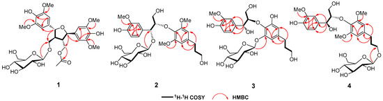 Key HMBC and 1H-1H COSY correlations of compounds 1–4.