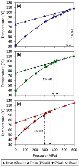 Maximum temperature under pressure (Tmax) (triangle symbol) and phase diagram (circle) of model fats at (a) 10%, (b) 20%, and (c) 30% of fully hydrogenated soybean oil (FHSBO) without (filled symbol) and with 1% salt (empty symbol). Vertical arrows show pressure threshold where crystallization temperature (Ts) crosses Tmax.