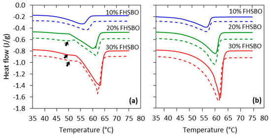Further analysis of Figure 2 (dotted thermogram in Figure 2b) shows that salt addition resulted in the formation of a broader exothermic peak (with higher ΔHm) for samples containing 20% and 30% FHSBO. The comparison of the samples ΔHm is shown with star symbols in Table 4. The increase in ΔHm may infer the formation of a higher amount of crystals in the samples that is in agreement with the significant increment of these sample’s solid fat content (SFC) shown in Table 5 [25]. This finding may translate into differences in crystallization behavior and the resulting network properties of the samples.