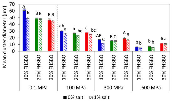 Mean cluster diameter of 10%, 20%, and 30% fully hydrogenated soybean oil (FHSBO), without and with 1% salt, crystallized at different pressure levels. Different upper-case or lower-case show significant difference (p < 0.05) between samples at different percentage of FHSBO.