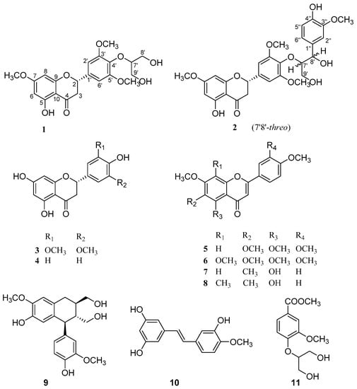 Areca nut is obtained from the fruit of the Areca catechu (Palmae), which is widely distributed in southeast Asia and southern China []. Areca nuts are regarded as a traditional Chinese medicine usually used for the treatment of indigestion, liver disorders, and also used as a vermifuge [,]. Previous pharmacological studies of areca nuts have demonstrated antibacterial, antioxidant, anti-inflammatory, antifungal, and anthelmintic activities [,]. In a search for novel and bioactive constituents from Chinese herbal medicines [,,,,], our group had reported three new areca alkaloids from the nuts of A. catechu []. In our continuing investigation, two new flavonoids calquiquelignan M (1), calquiquelignan N (2), and nine known compounds naringenin (3) [], dihydrotricin (4) [], sinesetin (5) [], nobiletin (6) [], 8-demethyleucalyptin (7) [], eucalyptin (8) [], (+)-isolariciresinol (9) [], rhapontigenin (10) [], glyceryl-2-vanillic acid methyl ester (11) [], were isolated from the same plant parts as shown in Figure 1. The new structures, including absolute configurations, were elucidated by spectroscopic data and electronic circular dichroism (ECD) calculation, and the known ones were identified by comparison with data in the literature. Herein, we report the isolation, structure elucidation, and cytotoxic activities of these compounds.
