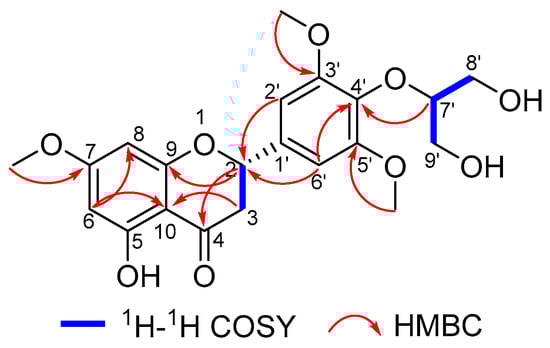 Calquiquelignan M (1) was isolated as a yellow powder. The molecular formula of 1 was assigned as C21H24O9 based on its HRESIMS at m/z 443.1310 [M + Na]+ (calcd for C21H24O9Na, 443.1313), indicating 10 degrees of unsaturation. The IR absorption showed the characteristic absorptions for hydroxyl (3477 cm−1), carbonyl (1660 cm−1) groups, and aromatic ring (1535 and 1450 cm−1). The UV spectrum exhibited absorption maxima at 287 and 208 nm. The 1H-NMR spectrum indicated the presence of four aromatic protons [δH 6.71 (2H, s, H-2′/6′), 6.09 (1H, s, H-8), 6.08 (1H, s, H-6)]; two methines [δH 5.36 (1H, dd, J = 13.0, 3.0 Hz, H-2), 4.08 (1H, m, H-7′)]; three methylenes [δH 3.05 (1H, dd, J = 17.0, 13.0, H-3α), 2.82 (1H, dd, J = 17.0, 3.0, H-3β), 3.77 (2H, d, J = 3.4 Hz, H-8′), 3.85 (2H, d, J = 3.4 Hz, H-9′)], and three methoxyls [δH 3.91 (6H, s), 3.82 (3H, s)]. The 13C-NMR spectrum displayed twenty-one carbon signals, including a carbonyl, eight quaternary carbons, six methines, three methylenes, and three methoxyls. With the aid of 1H–1H COSY, HSQC, and HMBC experiments, all of the 1H- and 13C-NMR signals of 1 were assigned as shown in Table 1.