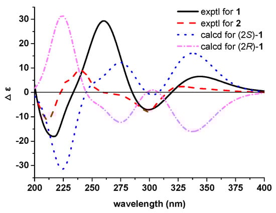 Generally, adjacent protons of the erythro type have been reported to have smaller coupling constants (2.8–5.6 Hz) than those of the threo type (6.0–8.6 Hz) in different d-solvents [,,]. Likewise, compound 2 was identified as a threo-configuration due to the 6.7 Hz coupling constants between H-7′ and H-8′ in CD3OD. Furthermore, the agreement of the ECD spectrum of 2 with those of 1 allowed the absolute configuration of 2 to be determined as 2S (Figure 3).