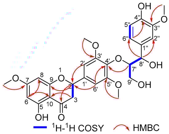 Calquiquelignan N (2) was obtained as a yellow powder, possessed a molecular formula C28H30O11 as established by its HR-ESI-MS at m/z 565.1685 [M + Na]+ (calcd for C28H30O11Na, 565.1680). The IR absorption revealed the presence of hydroxyl (3443 cm−1), carbonyl (1651 cm−1) groups, as well as an aromatic ring (1511 and 1429 cm−1). The UV spectrum showed the characteristic absorption maxima at 287, 230, and 208 nm. The 1H-NMR spectrum indicated the presence of seven aromatic protons [δH 7.03 (1H, s, H-2′′), 6.89 (1H, d, J = 8.0 Hz, H-6′′), 6.87 (2H, s, H-2′/6′), 6.77 (1H, d, J = 8.0 Hz, H-5′′), 6.12 (1H, s, H-8), 6.08 (1H, s, H-6)]; three methines [δH 5.45 (1H, dd, J = 11.0, 6.0 Hz, H-2), 5.02 (1H, d, J = 6.7, Hz, H-8′), 4.14 (1H, m, H-7′)]; two methylenes [δH 3.18 (1H, dd, J = 16.5, 11.0, H-3α), 2.81 (1H, dd, J = 16.5, 6.0, H-3β), 3.79 (1H, m, H-9′a), 3.37 (1H, m, H-9′b)], and four methoxyls [δH 3.89 (6H, s), 3.85 (3H, s), 3.84 (3H, s)]. The 13C-NMR spectrum displayed 28 carbon signals, including a chelated phenolic ketone carbon, eighteen olefinic carbons, three methines, two methylenes, and four methoxyls (Table 1). The above-NMR of 2 resembled those of 1, except for the absence of a methylene, and the present of a 1′′,3′′,4′′-trisubstitution phenyl ring and a methine at (δC 74.5). The signal at δC 74.5 was assigned to C-8′ indicated the 1′′,3′′,4′′-trisubstitution phenyl ring substituted there, which was supported by the HMBC correlations between H-8′ and C-2′′/C-6′′. Furthermore, the HMBC correlations between H-7′ and C-4′ confirmed the C-4′–O–C-7′ bond existence, and correlations between methoxy (δH 3.84) and C-3′′, led to the methoxy substitution position at C-3′′ (Figure 4). Thus, the planar structure of 2 was determined, as shown in Figure 4.