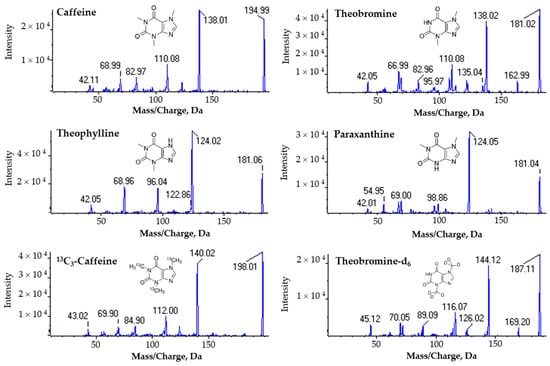 Fragmentation mass spectra by collision-induced dissociation (CID) of caffeine, theobromine, theophylline, paraxanthine and the internal standards 13C3-caffeine and theobromine-d6. Standard solutions were directly infused into the mass spectrometer in positive ionization mode and fragmentation was performed with a collision energy ramping. The presented fragmentation mass spectra are the combination of fragmentation data acquired for collision energies between 20–45 eV.