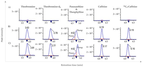 Extracted ion chromatograms corresponding to caffeine, theobromine, theophylline, paraxanthine and internal standards 13C3-caffeine and theobromine-d6 in (A) “blank” plasma samples, in (B) “blank” plasma spiked with each molecule and (C) pure solutions of each compound.