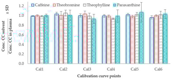 The concentrations of the calibrators from the calibration curves were re-calculated using the equations of the regression methods using the weighting factor 1/X2. Consequently, the ratio between the regressed concentrations in solvent and plasma calibration curves were determined and it was observed that data from both matrices were in accordance (ratio close to 1) for all the calibration points (Figure 3). The mean of the concentration ratios of all analytes was between 0.93 and 1.07. The coefficient of variation (%CV) was acceptable for caffeine, theobromine, and theophylline (0.8–8%) but paraxanthine suffered from higher standard deviations compared to the other molecules resulting in a range of CV% between 3–19% (Table S3).
