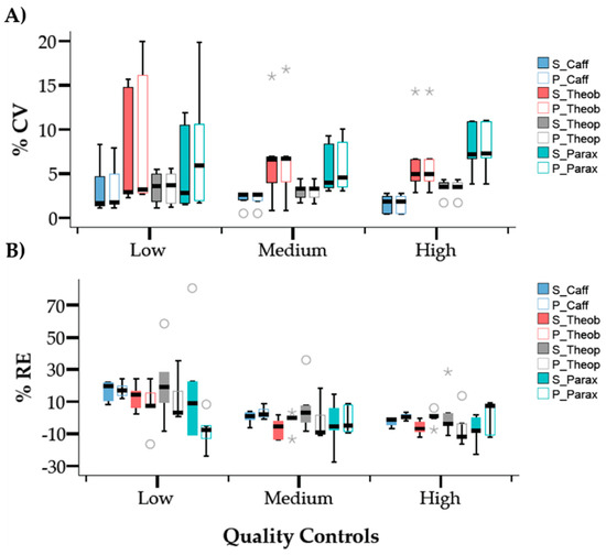 Box-plot representation for the results of the intra-day (n = 3) (A) precision and (B) accuracy for caffeine, theobromine, theophylline, and paraxanthine determined using calibration curves prepared in solvent (S) and plasma (P). Results for the precision study are expressed as the percentage of coefficient of variation (%CV) and for accuracy as the percentage of relative error (%RE). Each box plot represents determinations for five days. The circles and asterisks are outliers that represent cases having values more than 1.5 or three times the height of the boxes (interquartile difference Q3-Q1), respectively.
