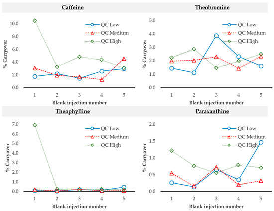 Carryover results for caffeine, theobromine, theophylline, and paraxanthine. After the injection of each concentration level of the quality controls, five blank solvent samples were analyzed and peak areas were divided by the peak area obtained for the LOQ. The graphs show the percentage of this ratio for each one of the five injections and considering each analyte. QC—quality control.