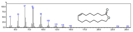 Mass spectrum and chemical structure of (Z)-Oxacycloheptadec-8-en-2-one (LRI 1914–2385) found in the present study.