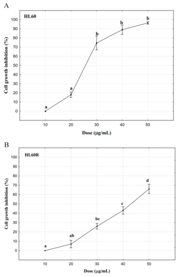 Cytotoxic activity of A. procera essential oil on HL60 (A) and HL60 R (B) cell lines. Cell viability was assessed by MTS. Data are expressed as mean ± standard error (SE) of at least three different experiments performed in triplicate. Different letters represent significant differences in cytotoxic activity among the concentrations of each cell line (Tukey test, p < 0.05).