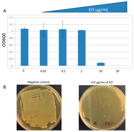 Increasing concentrations of EO were added to S. aureus ATCC25923 cultures to determine the minimal inhibitory concentration (MIC) by broth microdilution method. Evaluation of total bacterial count showed that the MIC of EO is 10 µg/mL, indeed the OD600 measurements were close to zero (Figure 5A). Thus, we plated a 100 µL aliquot of the bacterial suspension from the control well, and the well containing 10 and 20 µg/mL of EO onto the non-selective growth solid medium. The evaluation of vital bacterial cells showed that only 6 colonies grew in presence of 10 µg/mL EO (Figure 5B) and no colonies in presence of 20 µg/mL (data not shown). This latter result demonstrated that EO does not only inhibit bacterial growth but has a bactericidal effect and revealed that 20 µg/mL correspond to the minimal bactericidal concentration (MBC) (Figure 5B).